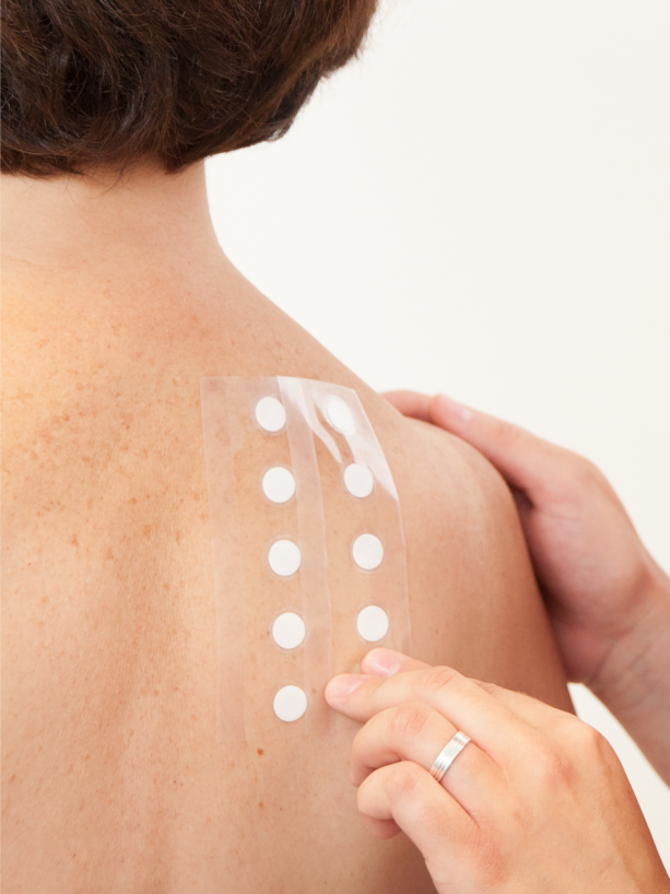 Beim ersten Termin wird Ihr Rücken mit den speziellen Testpflastern beklebt, die für 48 Std. (2 Tage) dort verbleiben.